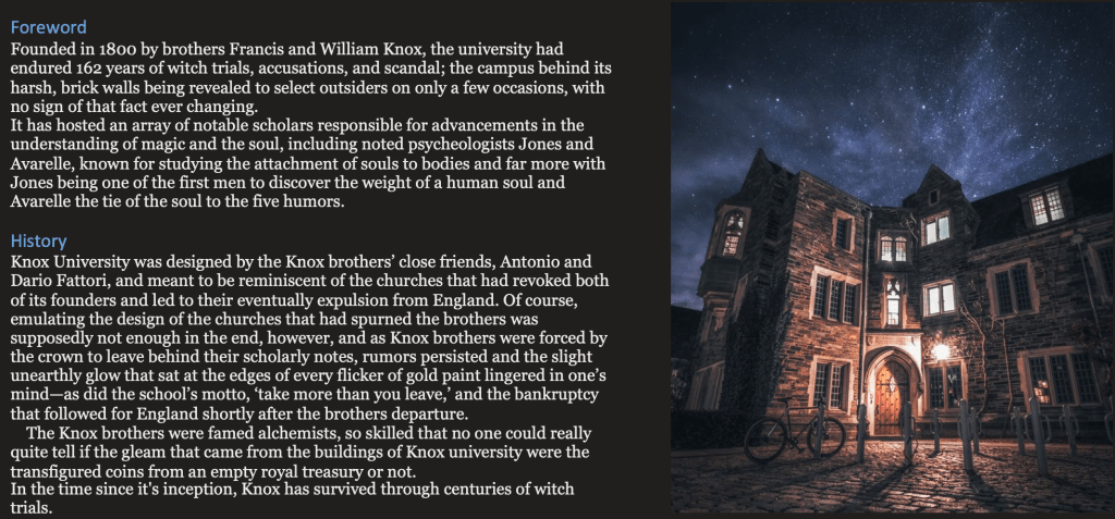 Typically I have a bunch of binders and bullet journals full of other information about my series, and I would be completely willing to type up the rest of the University of the Unseen’s information and maybe even show my hand drawn map of the campus if that’s something people are interested in. Later on, I also have maps and notes for Alice and Whynne that I could type up as well, and have already worked on doing so in the case of Whynne.